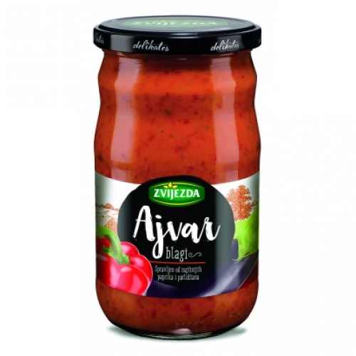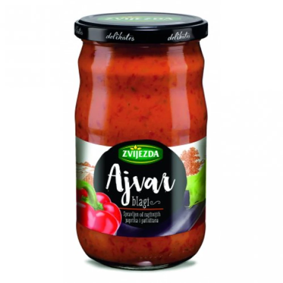 A Zvijezda Ajvár valóban nagyon különleges ízvilággal rendelkezik, köszönhetően a kiváló minőségű alapanyagoknak, és az összetevők a gyártó egyedi recepje szerinti feldolgozásának. Felnasználható: szóazköretnek, szendvicsekhez, grillezett húsokhoz. Összetevők: paprika, kék padlizsán, napraforgóolaj, ecet, étkezési só, cukor, fekete bors és fokhagyma kivonat.