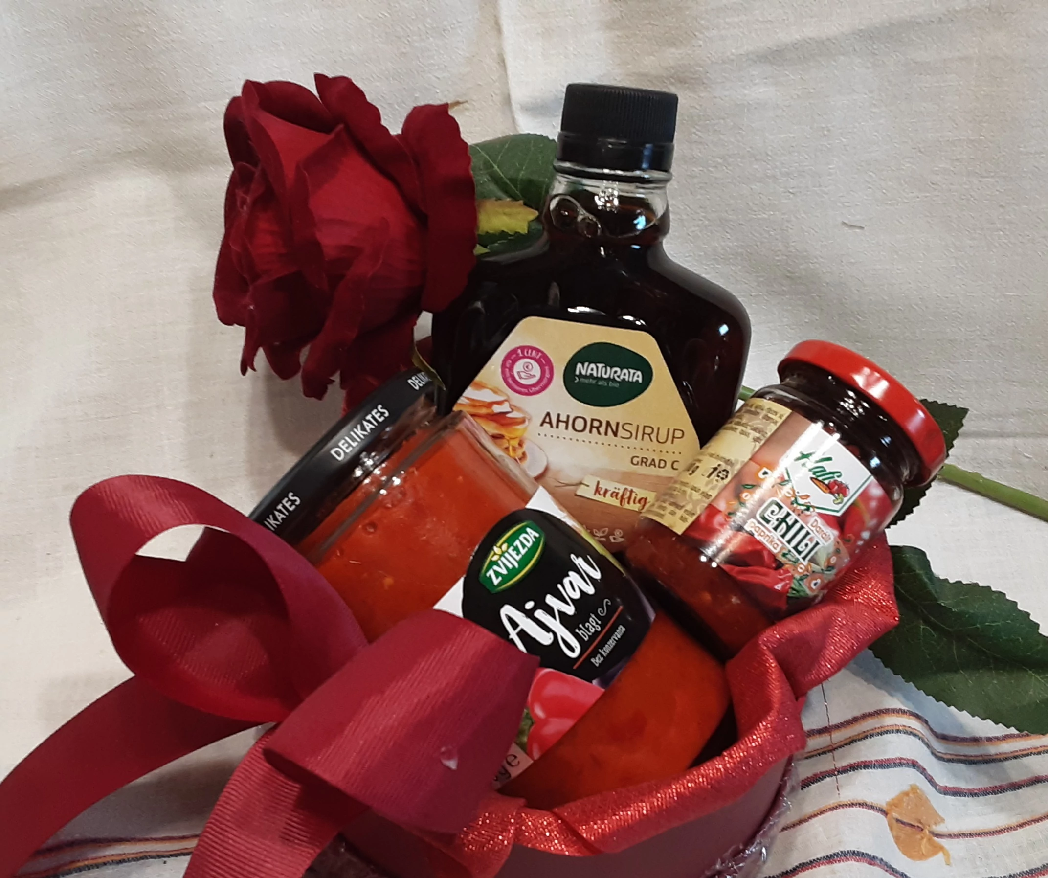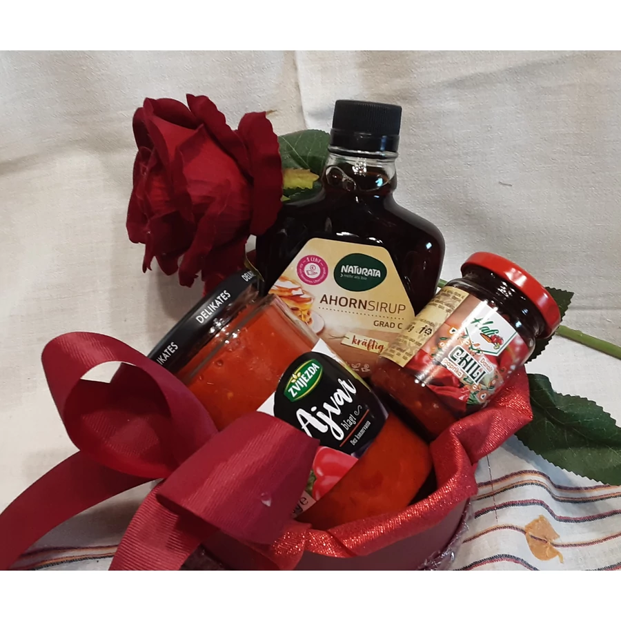 A csomag tartalma: 1 ü Bio Juharszirup 0,2 l, 1 ü Zajezda Ajvár 350 g, 1 ü Chili 100 g, 1 szál selyemrózsa.