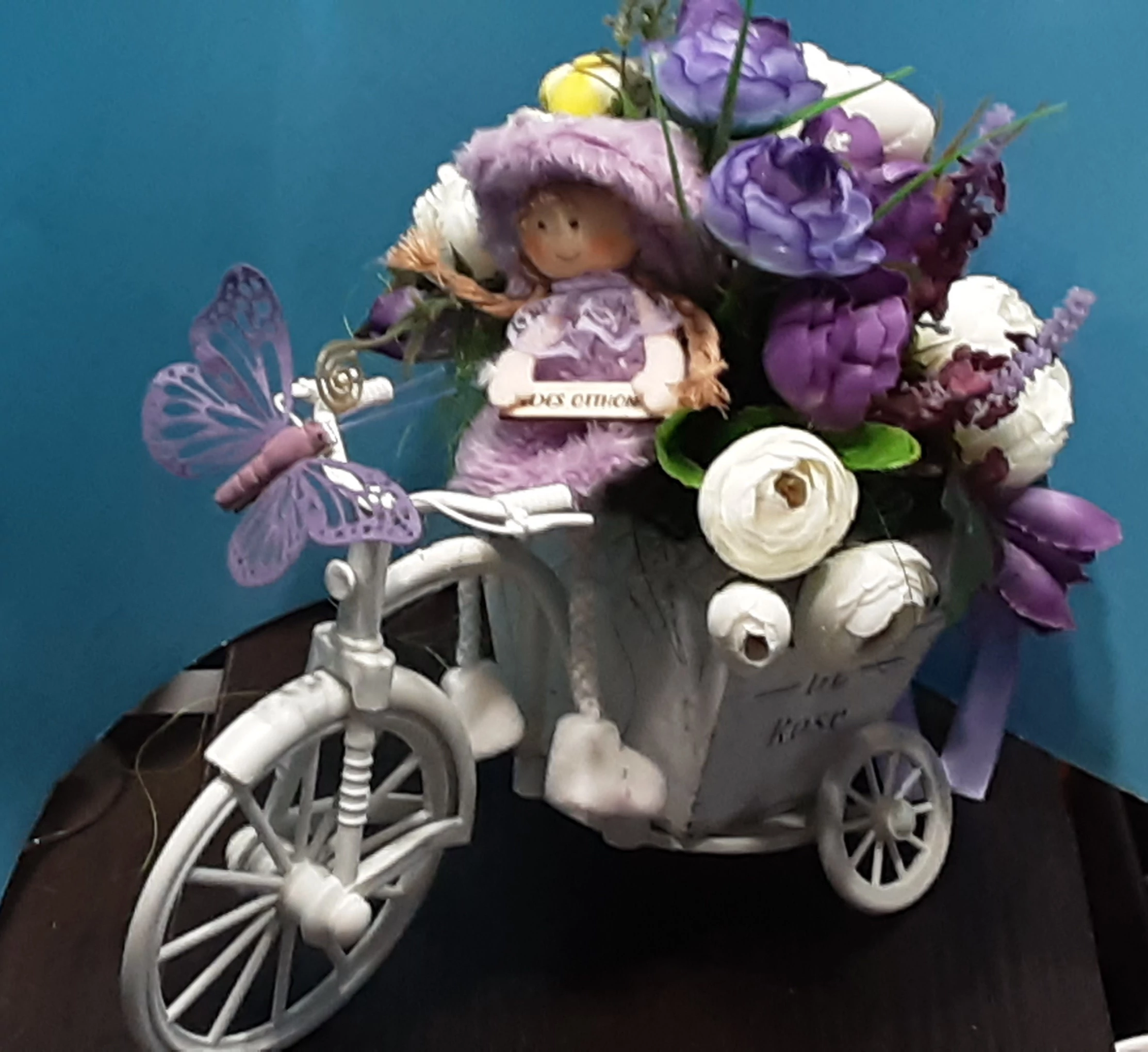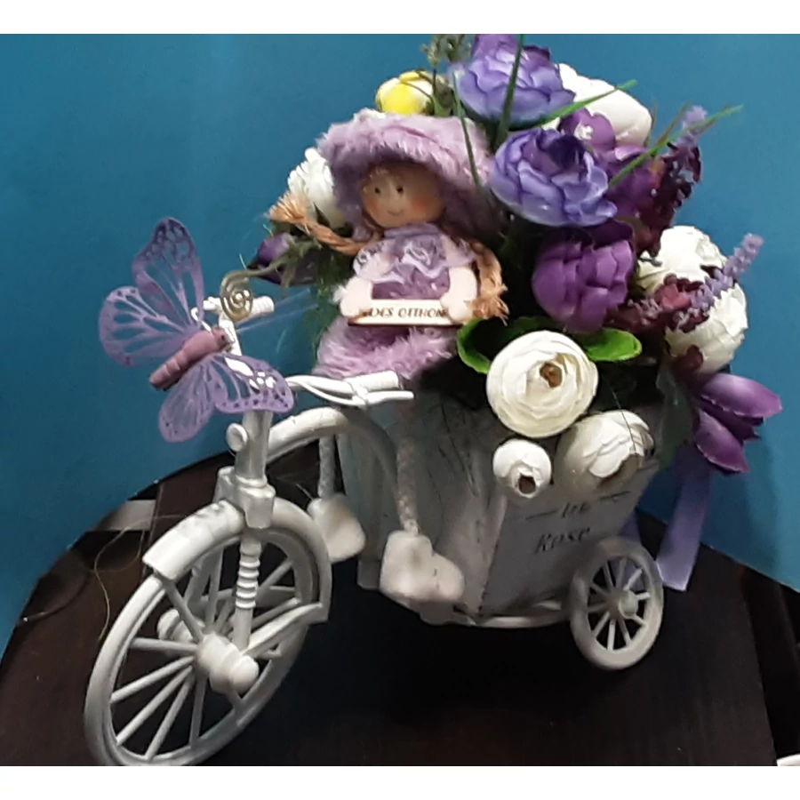 Virágcsokrot szállító lila ruhás manólány, fehér triciglin. Dekorációs termék, különlegesség, névnap, születésnap köszöntésére.