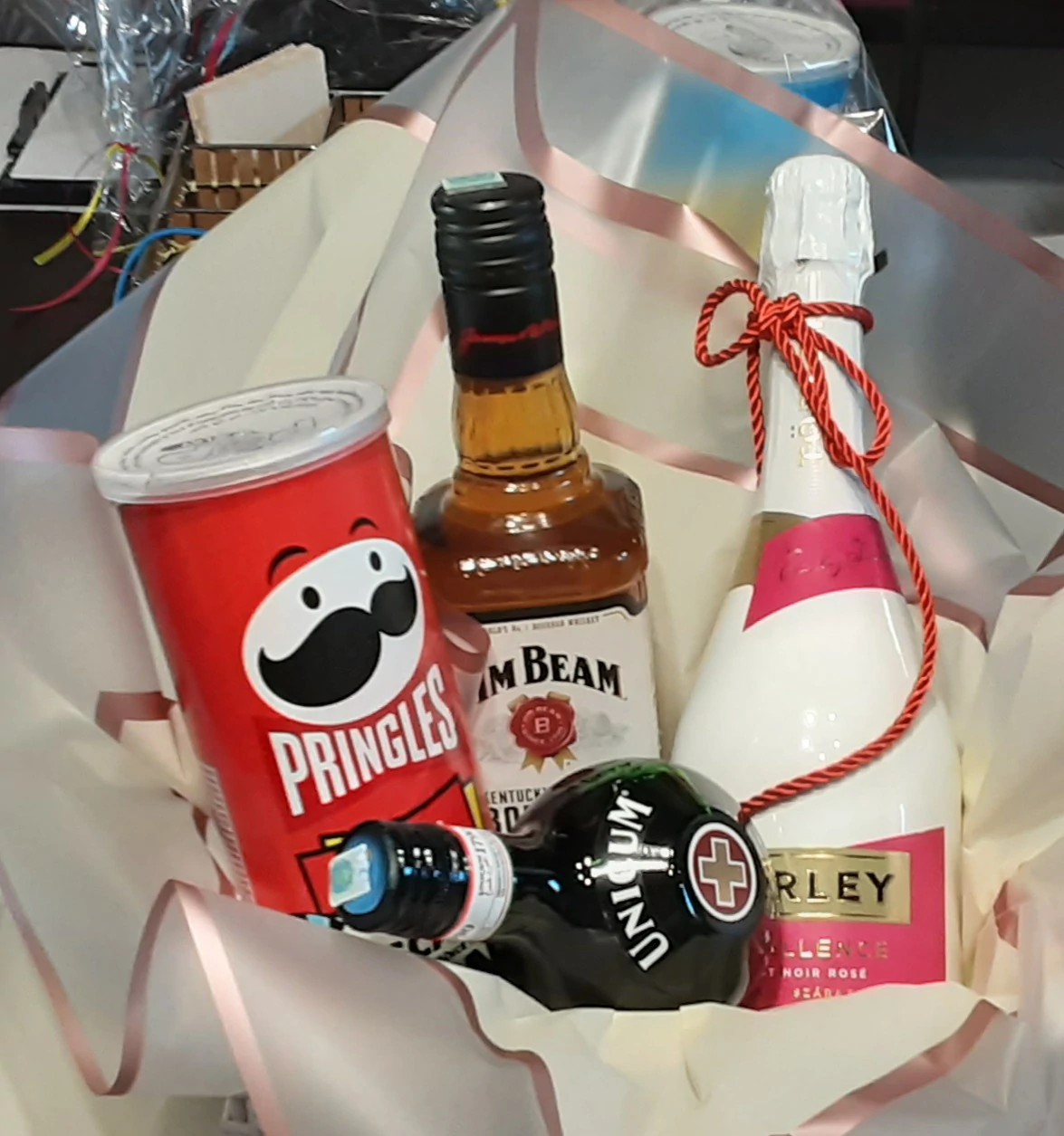 A kosár tartalma : 1 ü Törley pezsgő, 1 ü Unicum 0,2l , 1 ü Jim Beam Bourbon wisky 0,5 l, 1 cs Pringles chips. Csak 18 + vásárlóknak !