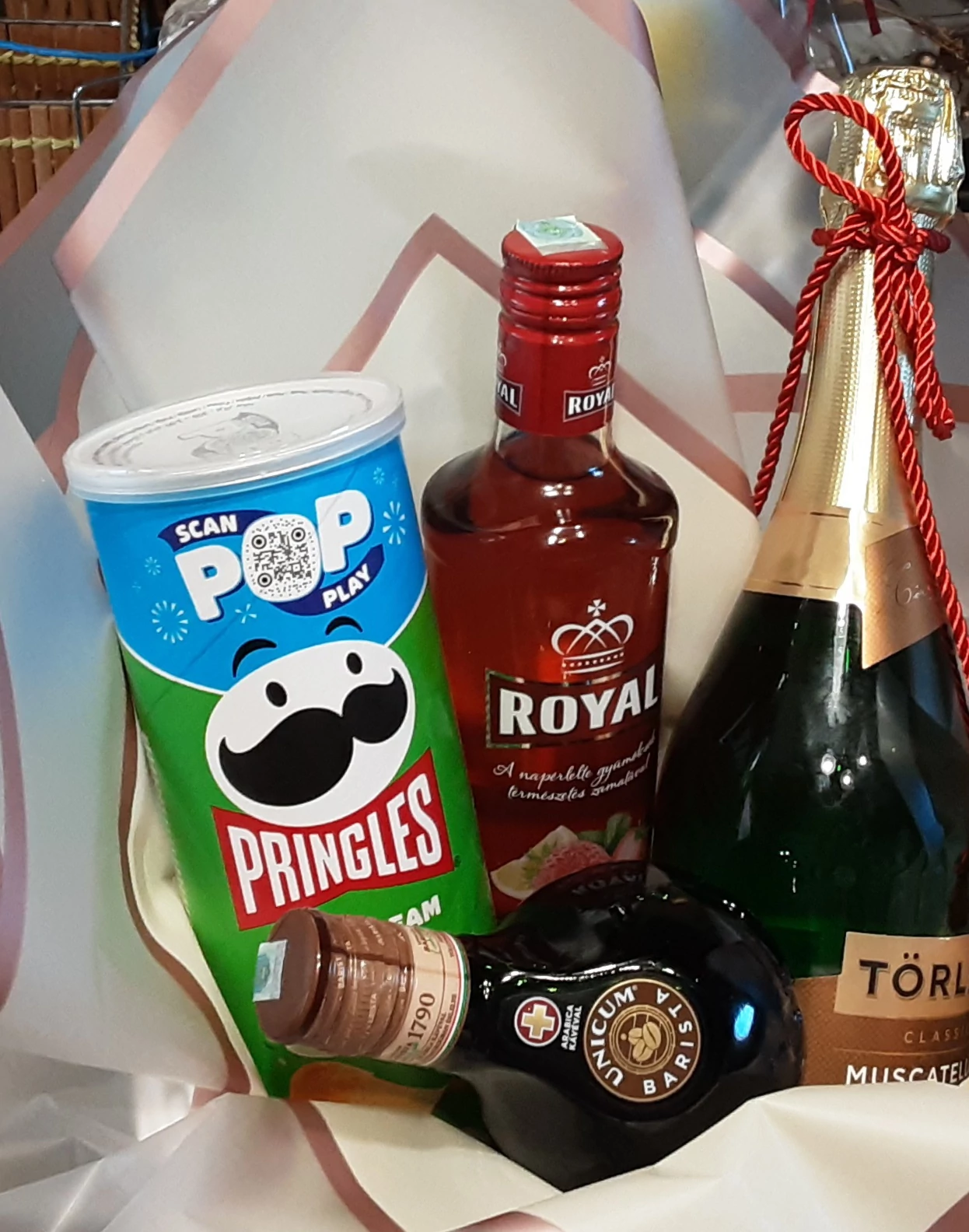 A kosár tartalma : 1 ü Tőrley pezsgő, 1 ü Unicum 0,2 l , 1 ü Royal vodka epres - citromos, 1 cs Pringles chips. Csak 18 + vásárlóknak !