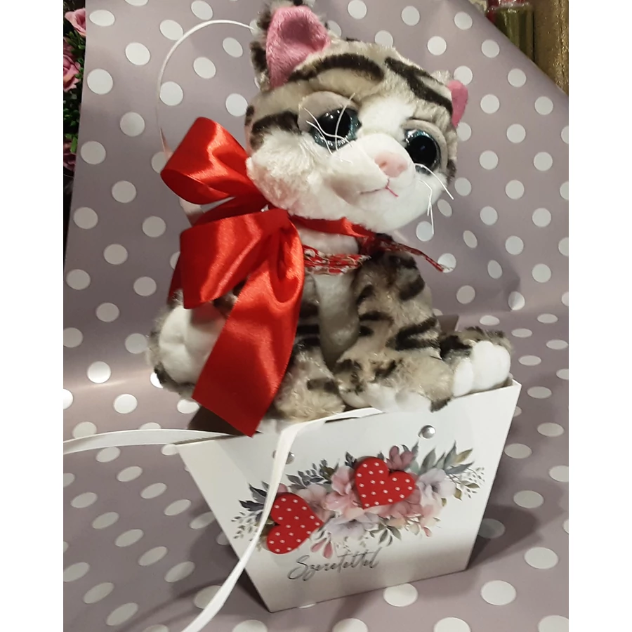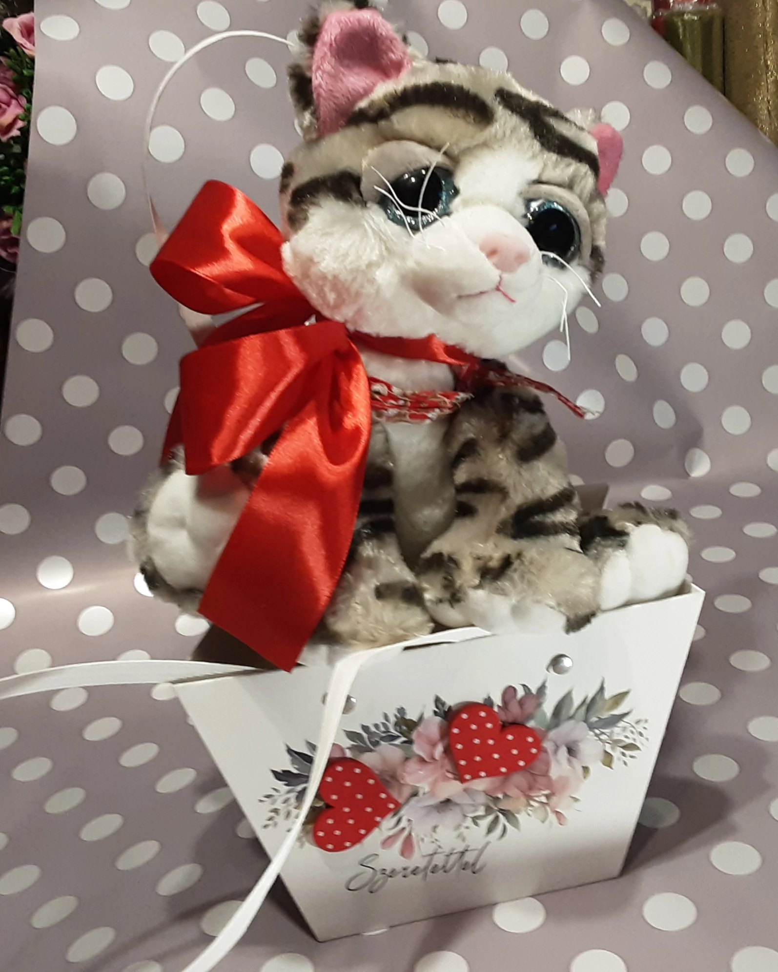 Piros szalagos pihe - puha macsek, szerethető, kedves figura. Ajándékozásra, valentivra, nőnapra kiváló választás.
