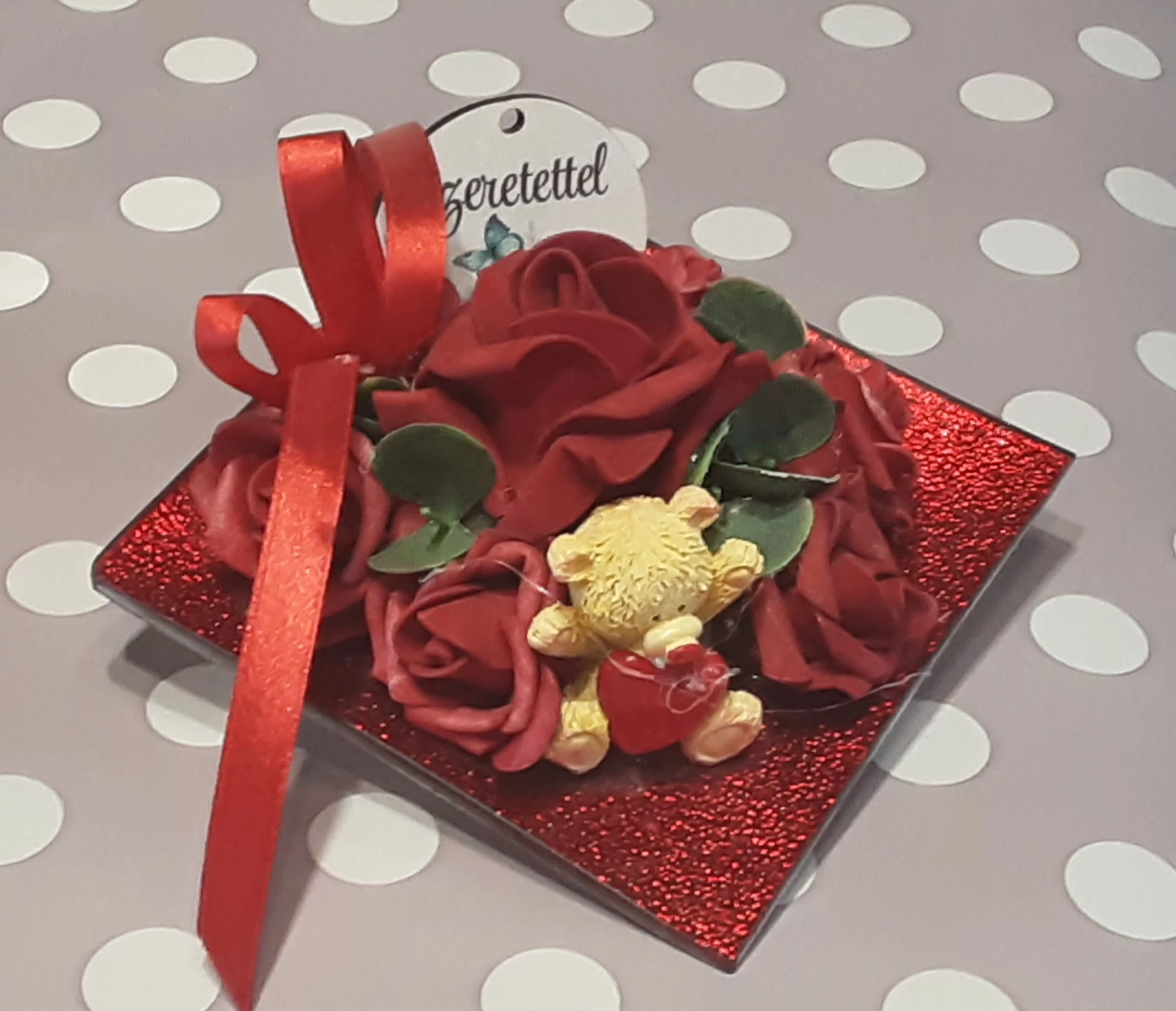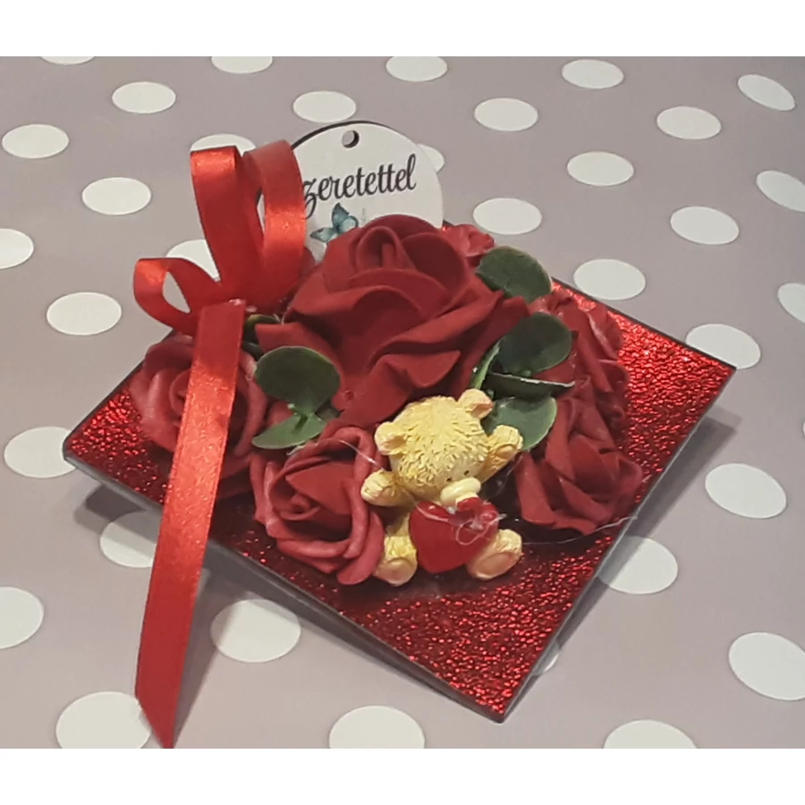 Üvegtát piros rózsákkal , kerámia figurával.Asztaldísz 18×10×10cm