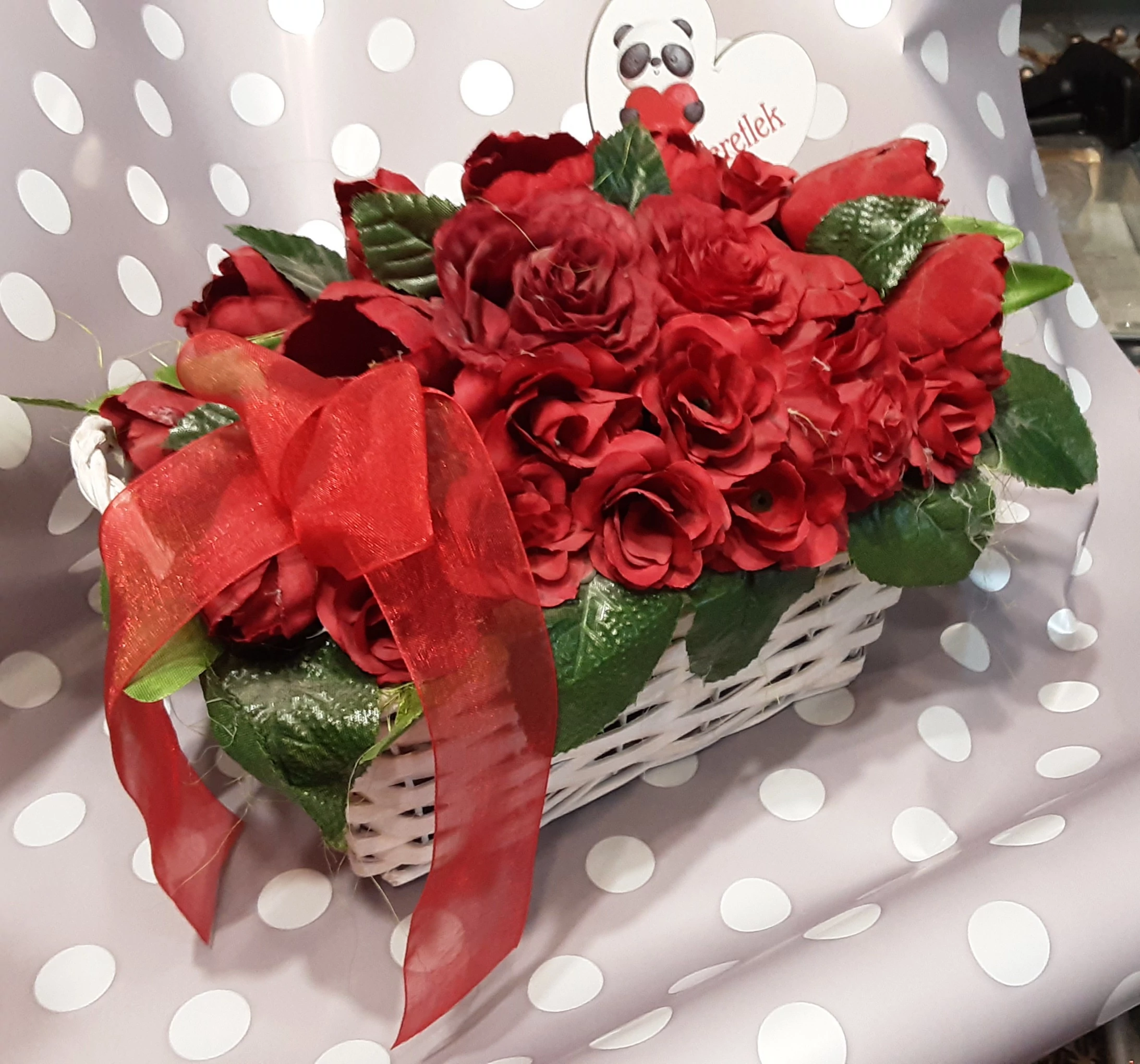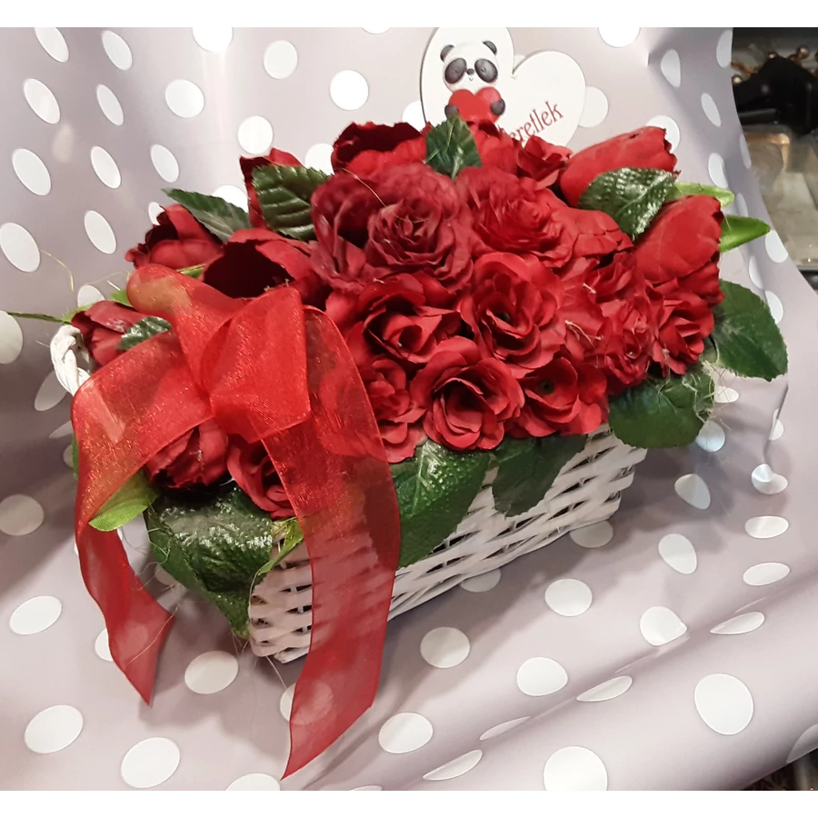 Piros selyemvirágok fehér kosárban, a szeretet ajándéka .Asztaldísz,kézműves termék.